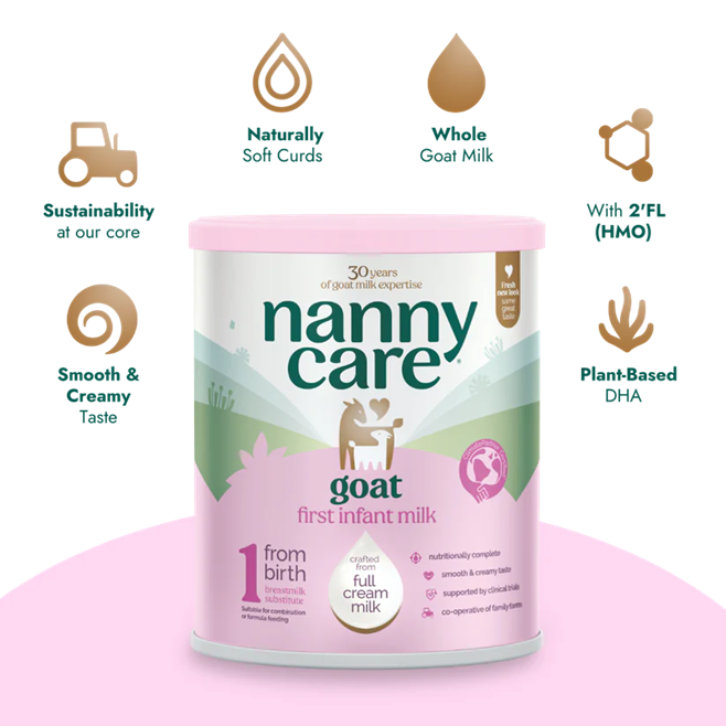 Now in refreshed packaging with thoughtful updates to the formulation, Nannycare Stage 1 First Infant Milk stays true to what matters most— whole A2 goat milk base, minimal processing, and quality ingredients. As goat milk formula experts, they combine over 30 years of specialist research and clinical trials with carefully chosen ingredients. Made with their own premium whole A2 goat milk, it is suitable from birth and now includes 2’FL (HMO) and plant-based DHA (algal oil), replacing fish oil.